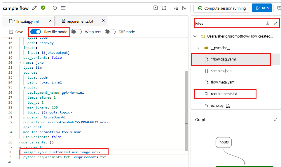 При желании можно указать дополнительные пакеты, которые вам нужны в requirements.txt. В корневой папке папки потока можно найти requirements.txt . При развертывании потока запроса в управляемой сетевой конечной точке в пользовательском интерфейсе по умолчанию развертывание использует среду, созданную на основе базового образа, указанного в flow.dag.yaml , и зависимостей, указанных в requirements.txt.