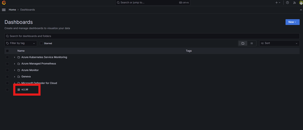 Перейдите к конечной точке управляемой Grafana, просмотрите доступные панели и выберите панель vLLM.