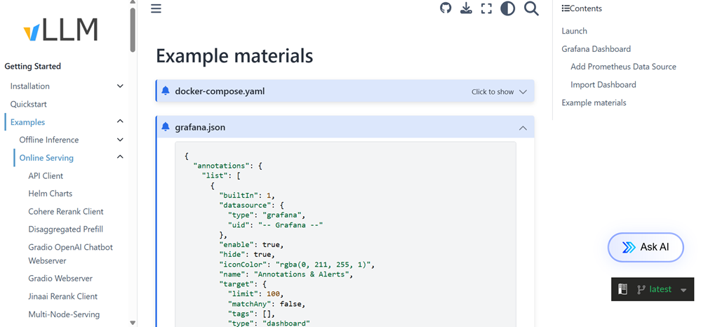 Проект vLLM предоставляет конфигурацию панели мониторинга Grafana с именемgrafana.json для мониторинга рабочей нагрузки вывода. Перейдите к нижней части этой страницы и скопируйте все содержимое