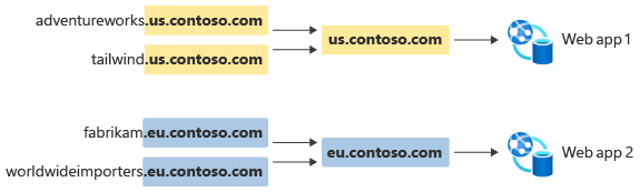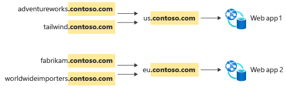 Рассмотрим пример мультитенантного решения, созданного Contoso. Клиенты покупают продукт Contoso для управления созданием счетов. Contoso назначает всем арендаторам собственный поддомен в рамках доменного имени contoso.com. Если компания Contoso использует региональные развертывания, то она может назначать поддомены в доменах us.contoso.com и eu.contoso.com.