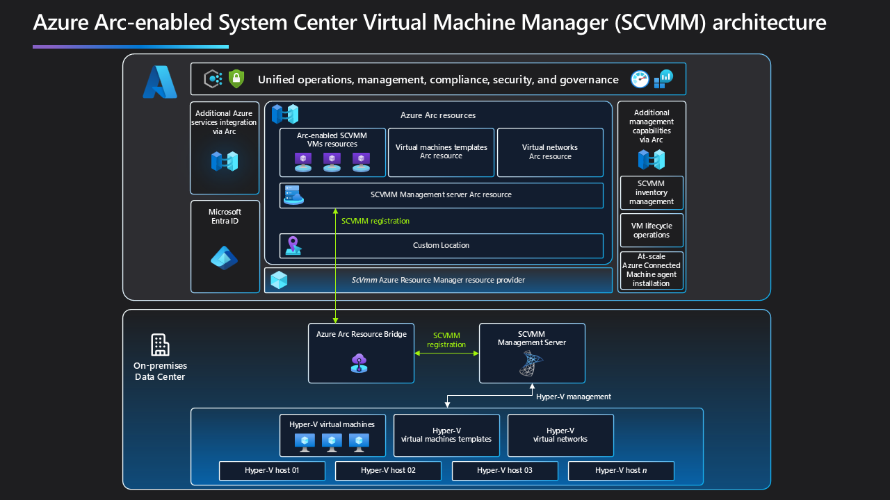 Azure Arc-совместимый System Center Virtual Machine Manager (SCVMM) позволяет клиентам System Center подключать свою среду VMM к Azure и выполнять операции самообслуживания виртуальных машин из портала Azure. SCVMM, поддерживаемая Azure Arc, расширяет контрольную плоскость Azure на инфраструктуру, управляемую SCVMM, что позволяет последовательно использовать возможности безопасности, управления и организации Azure в пространствах, управляемых System Center и Azure.