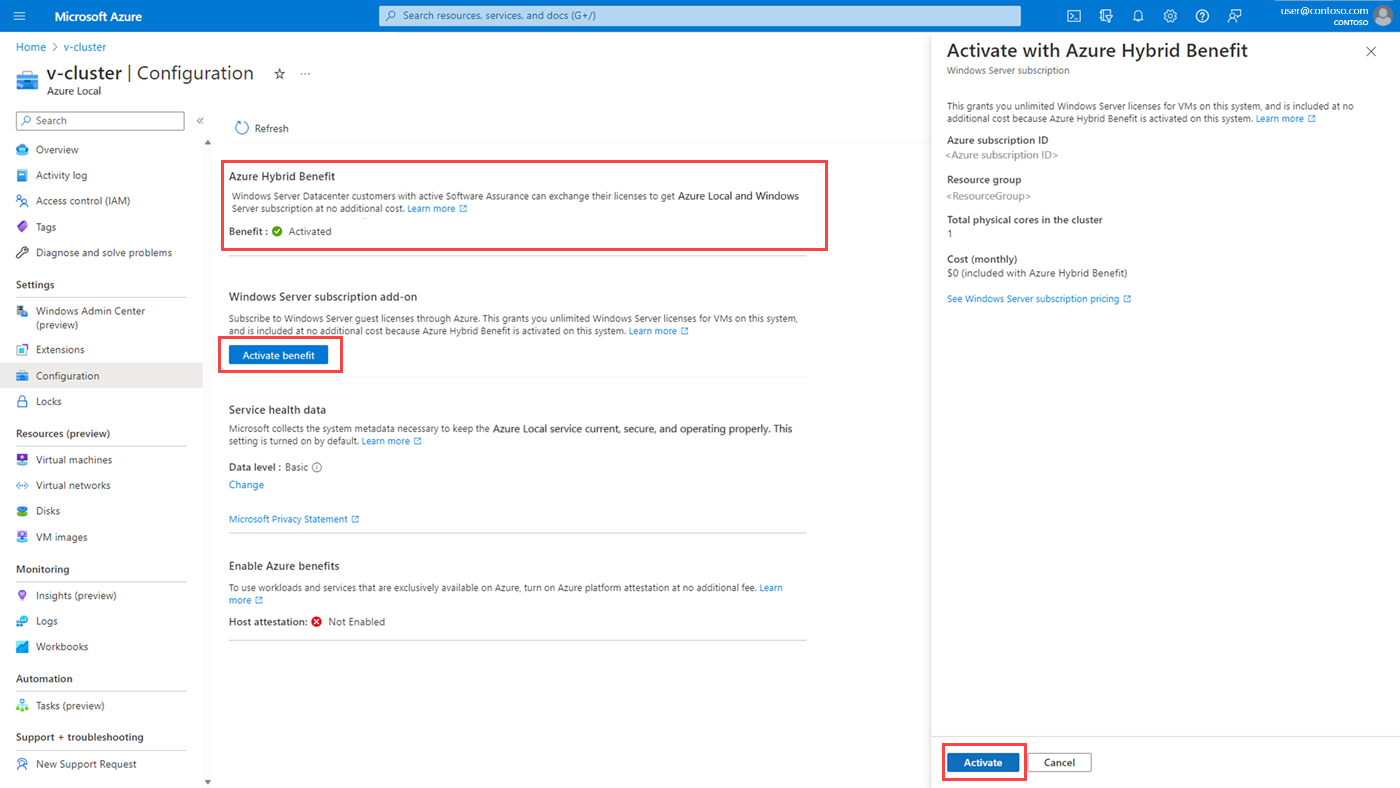 Чтобы включить подписку Windows Server без дополнительных затрат, в разделе надстройки подписки Windows Server в той же области конфигурации выберите "Активировать преимущество".