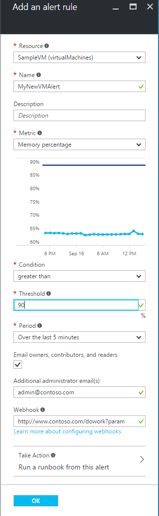 При использовании службы автоматизации Azure можно выбрать модуль runbook, который будет выполняться при срабатывании оповещения.