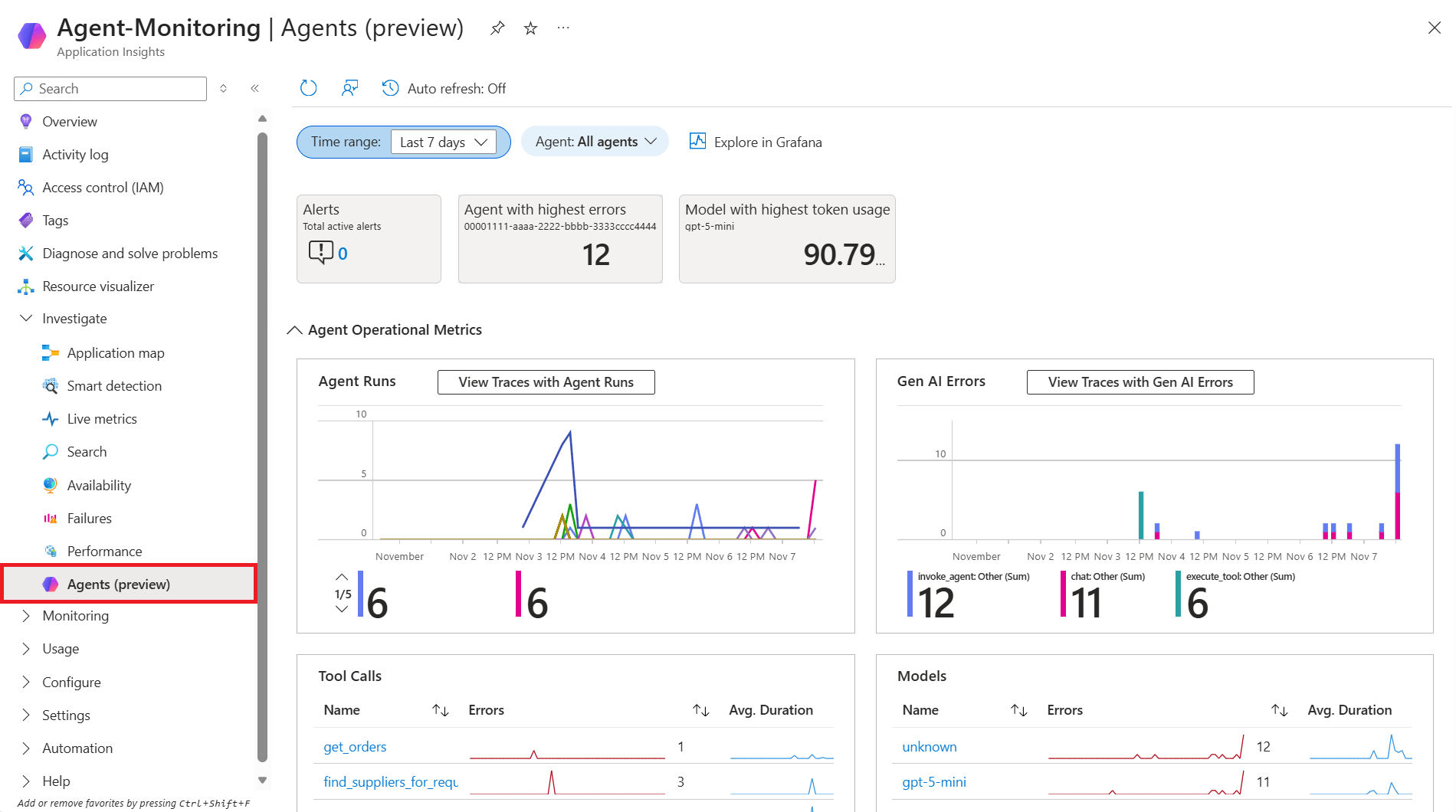 Представление сведений об агенте в Application Insights предлагает настроенный, готовый к использованию интерфейс для мониторинга ваших агентов ИИ. Для более продвинутой настройки и визуализации вы можете выбрать Обзор в Grafana на верхней панели навигации в представлении сведений об агенте.