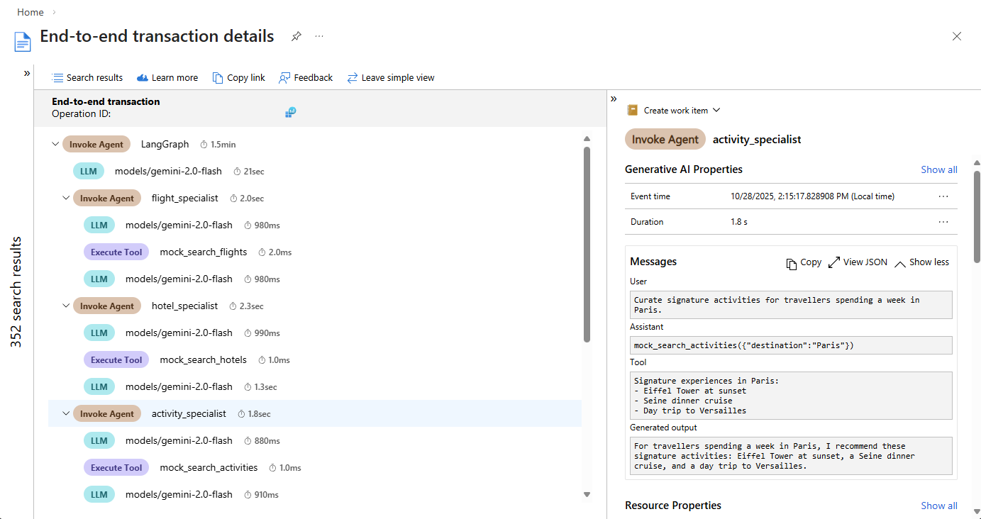 Подробные сведения о транзакциях теперь предлагают простое представление, в котором показаны шаги агента в четкой, сюжетной форме, включая вызываемый агент, базовый LLM, выполненные инструменты и многое другое.
