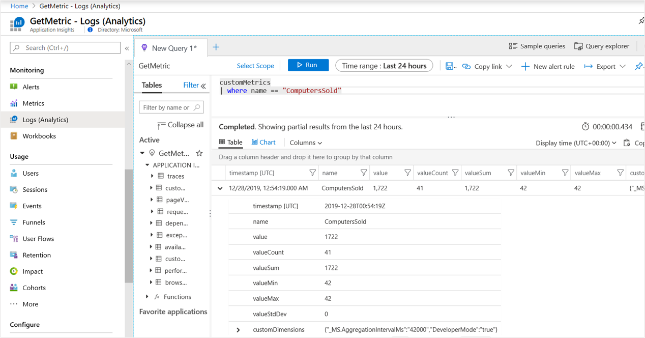 В Log Analytics пользовательские метрики и свойства отображаются в customMeasurements и customDimensions атрибутах каждой записи телеметрии.