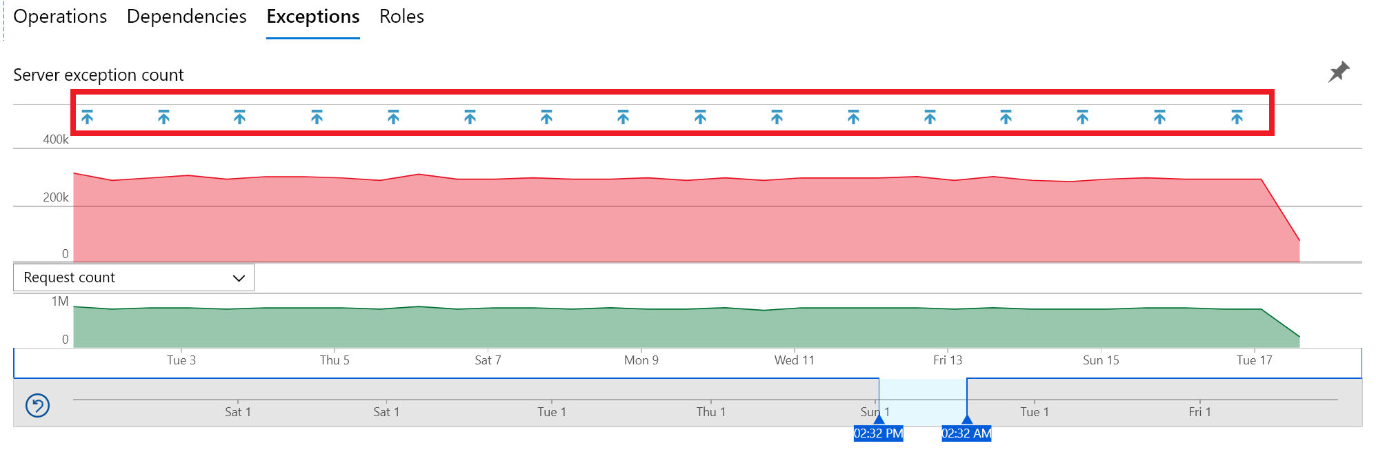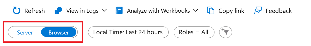 Вы можете выбрать, какую службу (имя облачной роли) или какой компьютер/контейнер (экземпляр облачной роли) вы хотите просмотреть из меню фильтра Ролей. Это действие позволяет изолировать проблемы или тенденции производительности в определенных частях приложения.