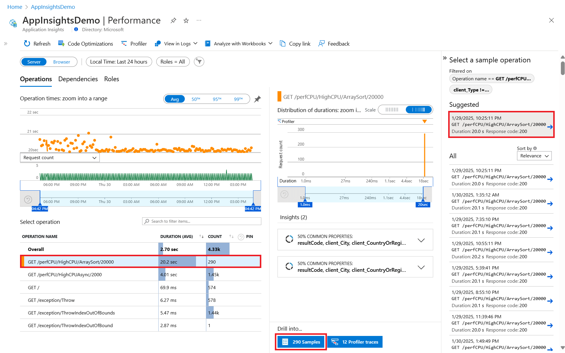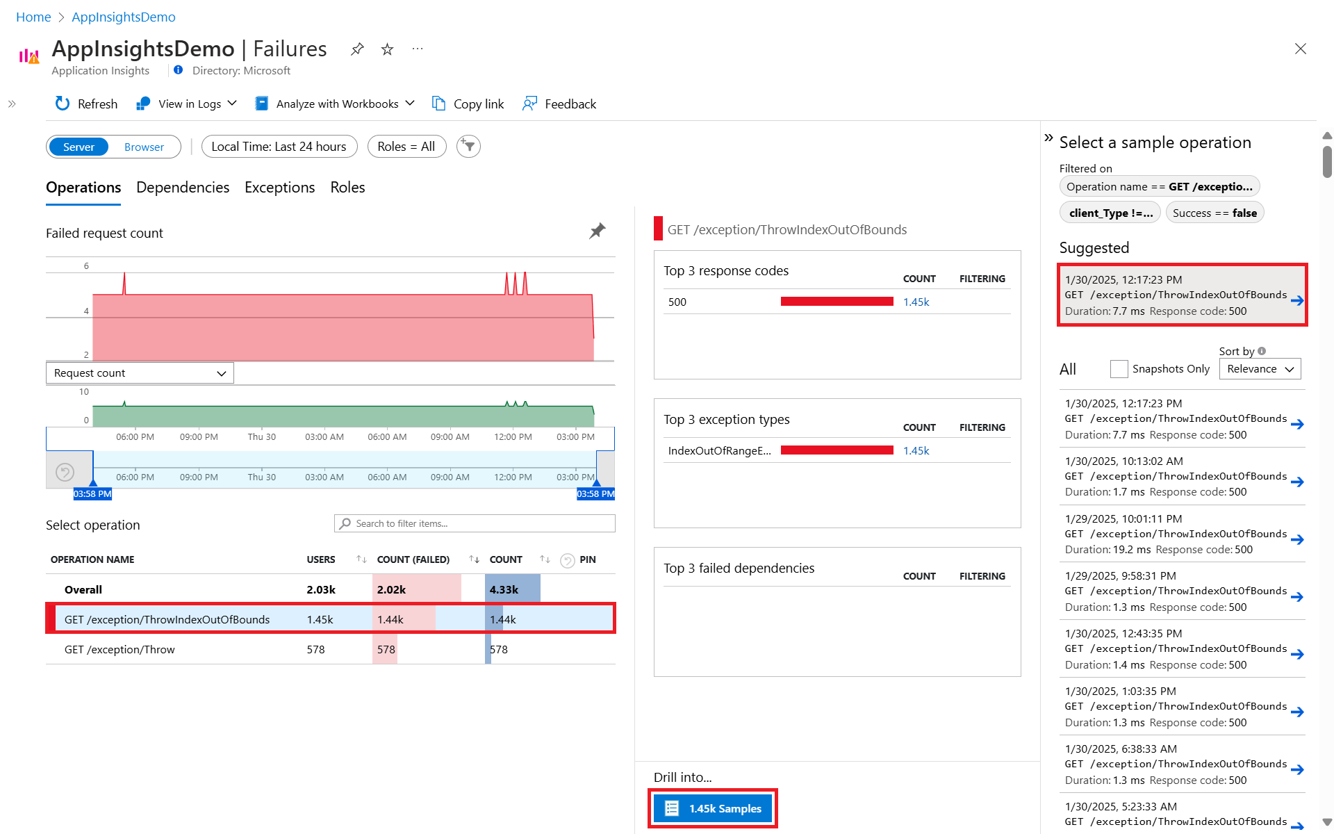 1. Выберите операцию, чтобы просмотреть Топ-3 кода ответов, Топ-3 типа исключений и Топ-3 сбоя зависимостей для этой операции.