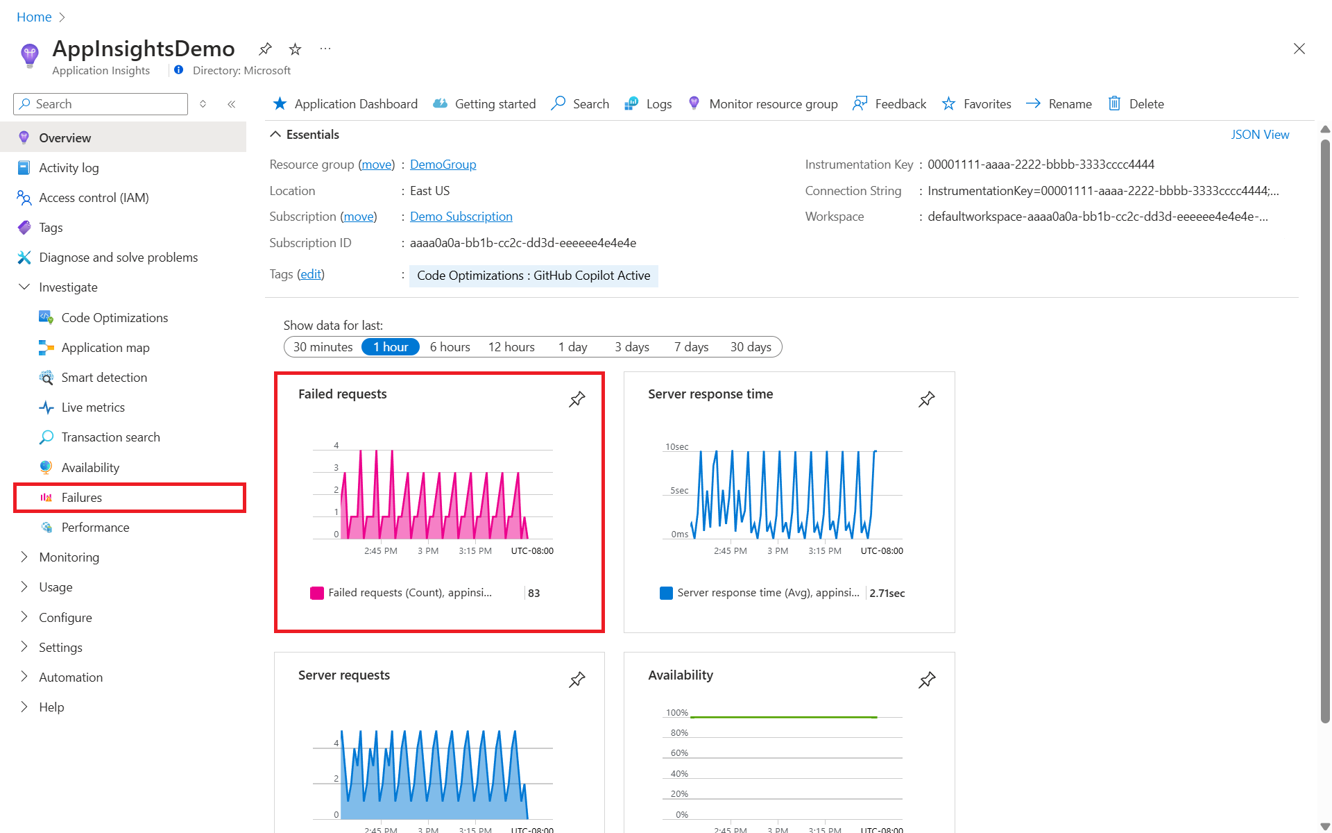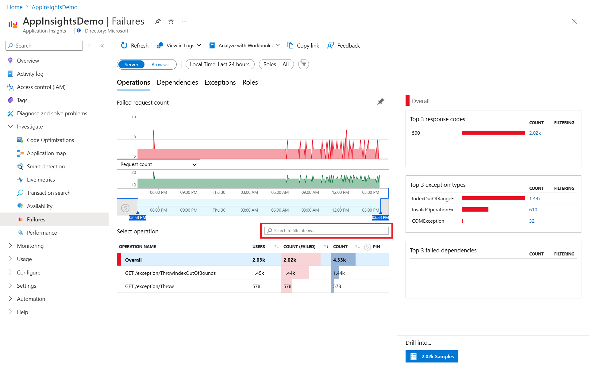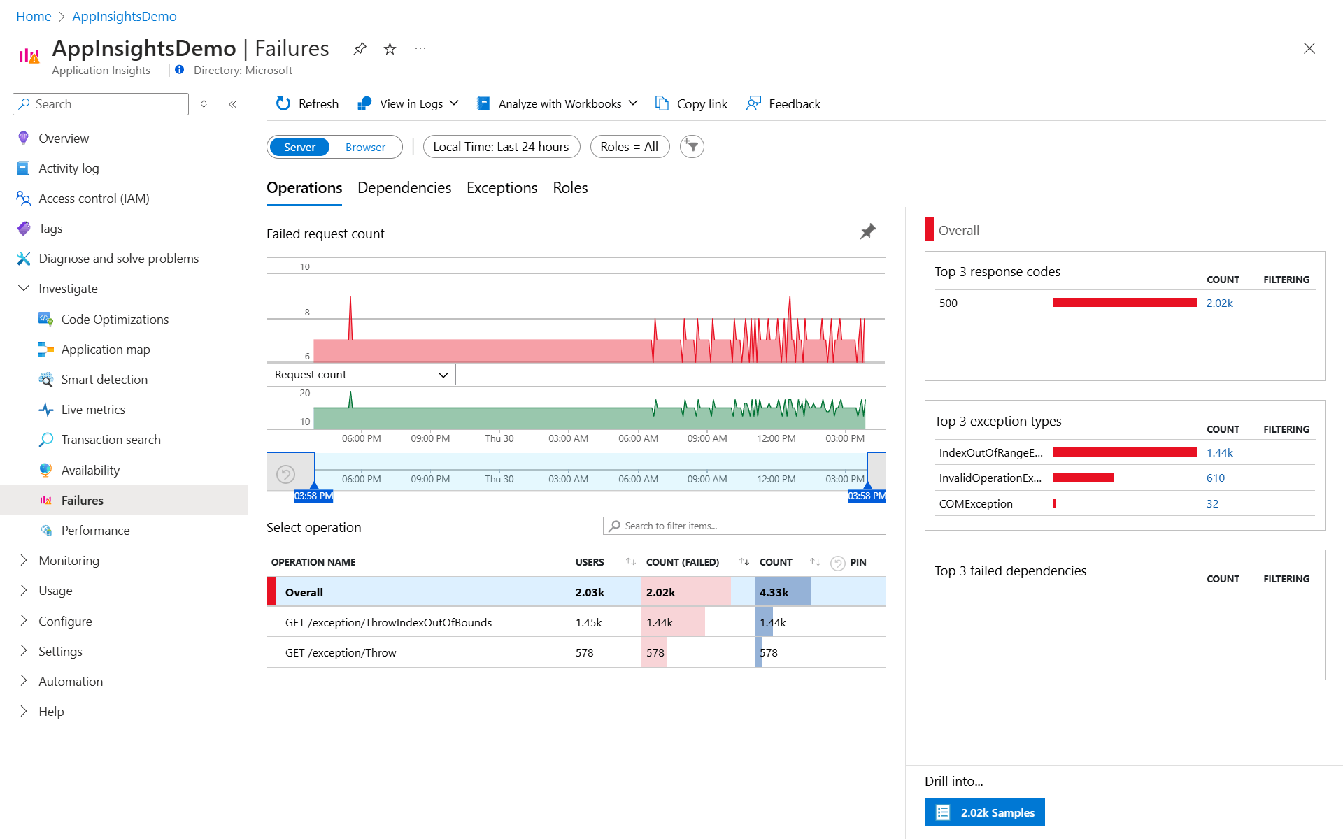 Чтобы получить представление "Сбои " в Application Insights, выберите граф неудачных запросов на панели обзора или сбои в категории "Исследование " в меню ресурсов.
