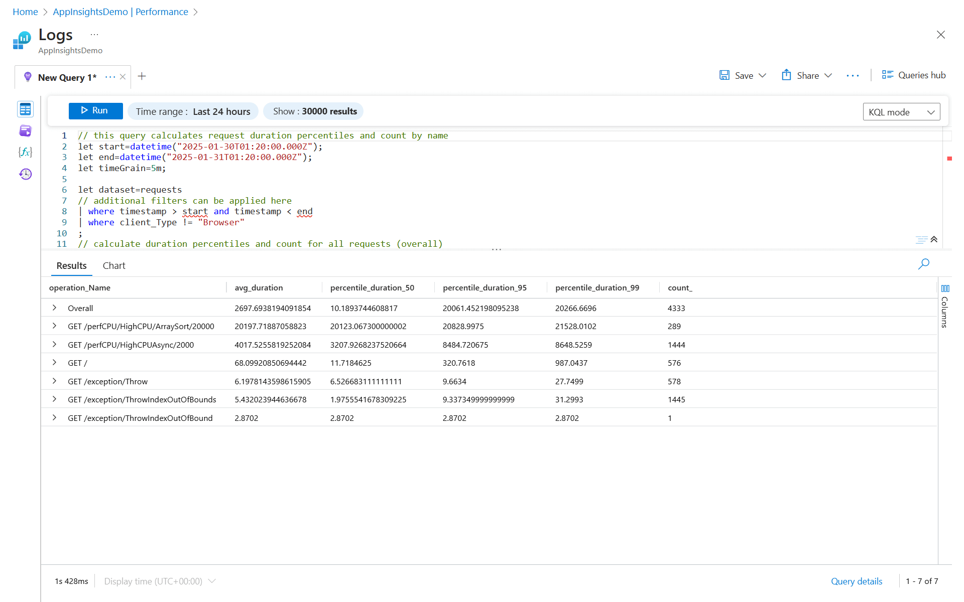 Как и данные, собранные для производительности сервера, Application Insights делает все клиентские данные доступными для глубокого анализа с помощью журналов.