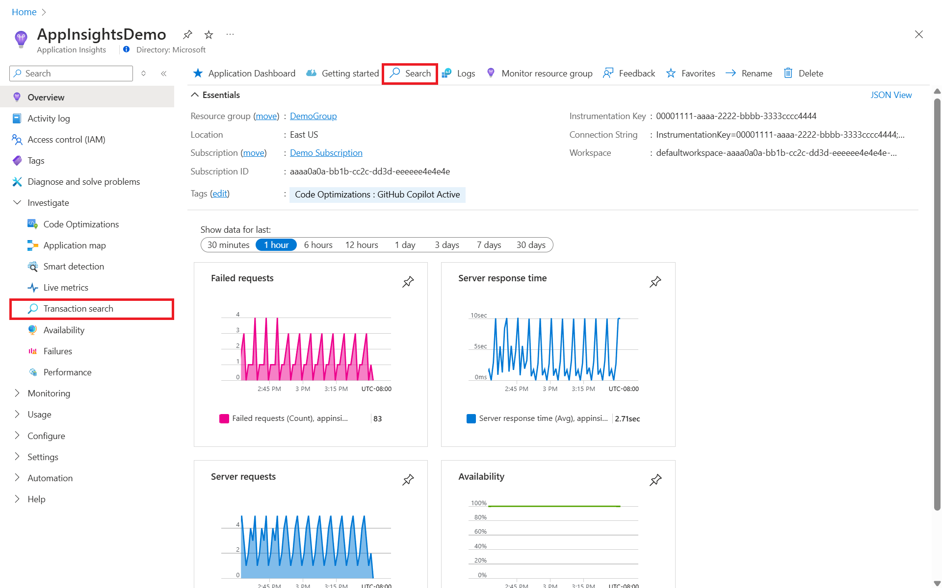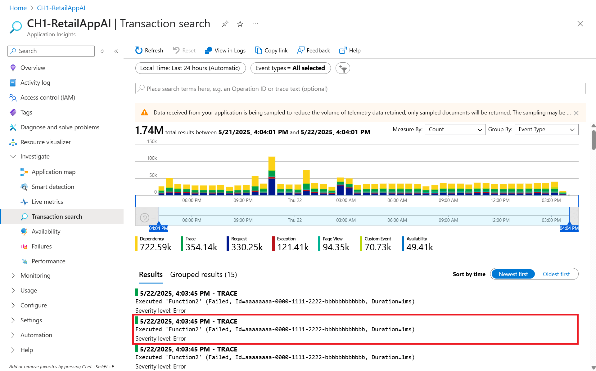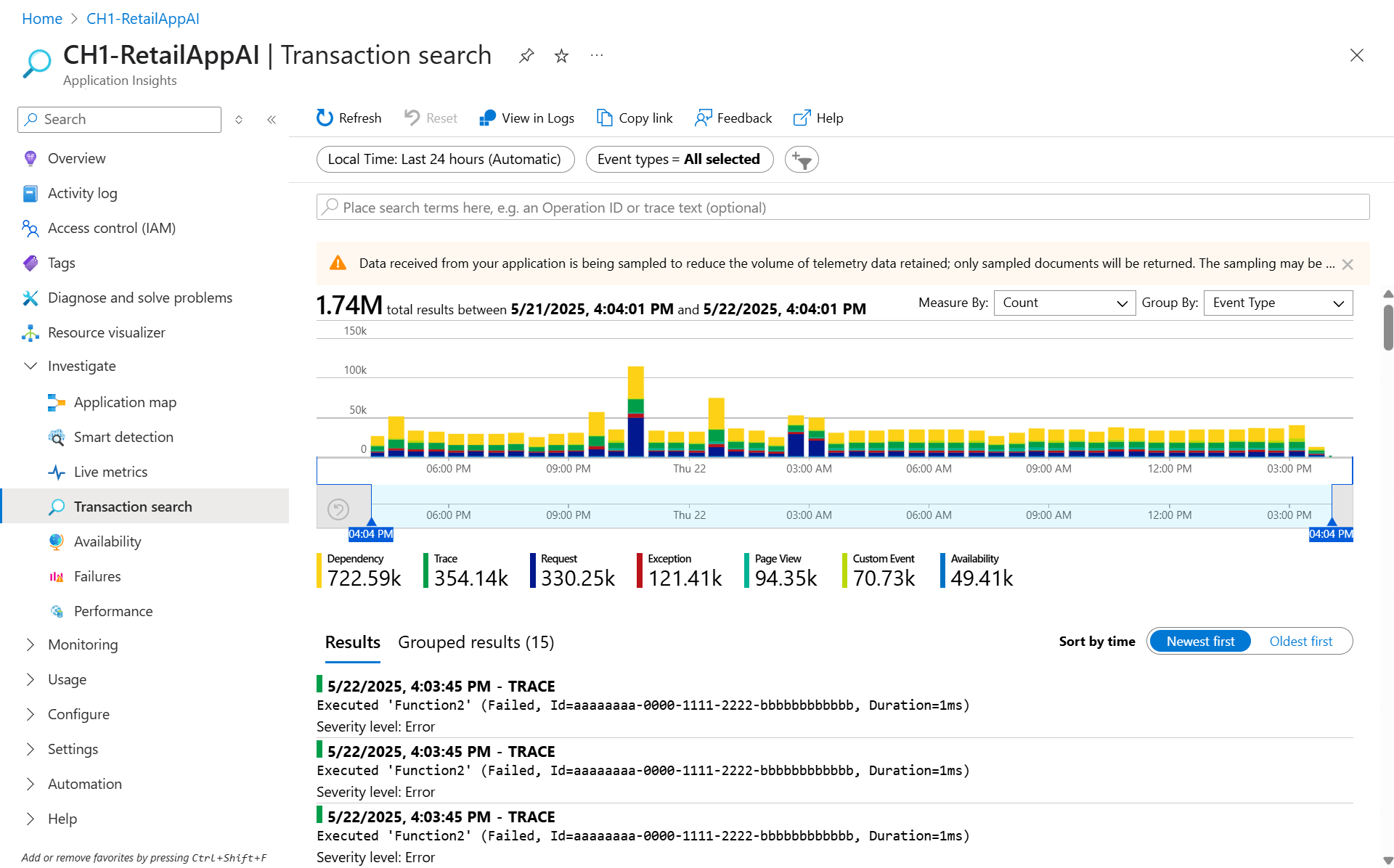 Изучение сбоев, производительности и транзакций с помощью Application Insights