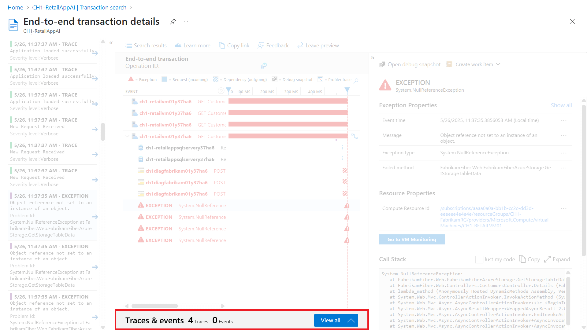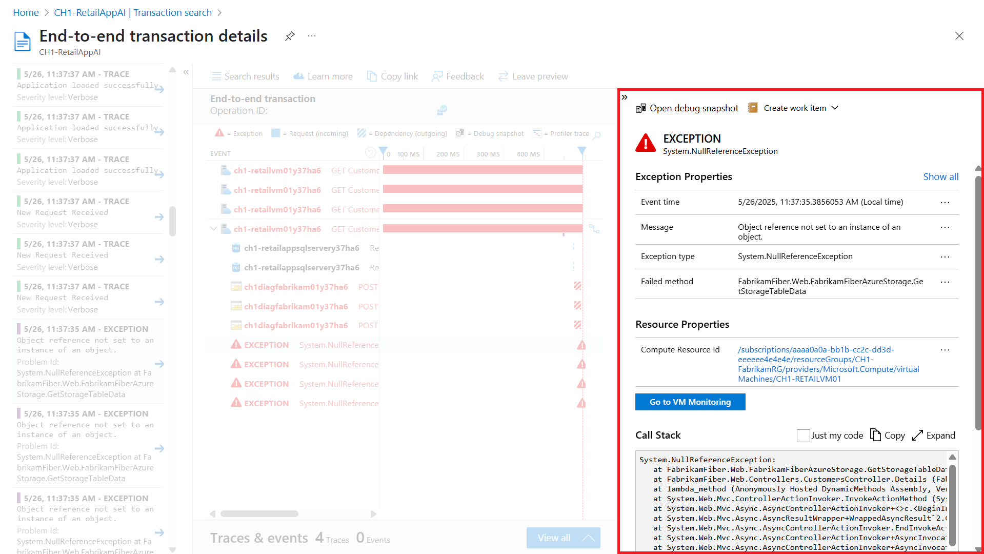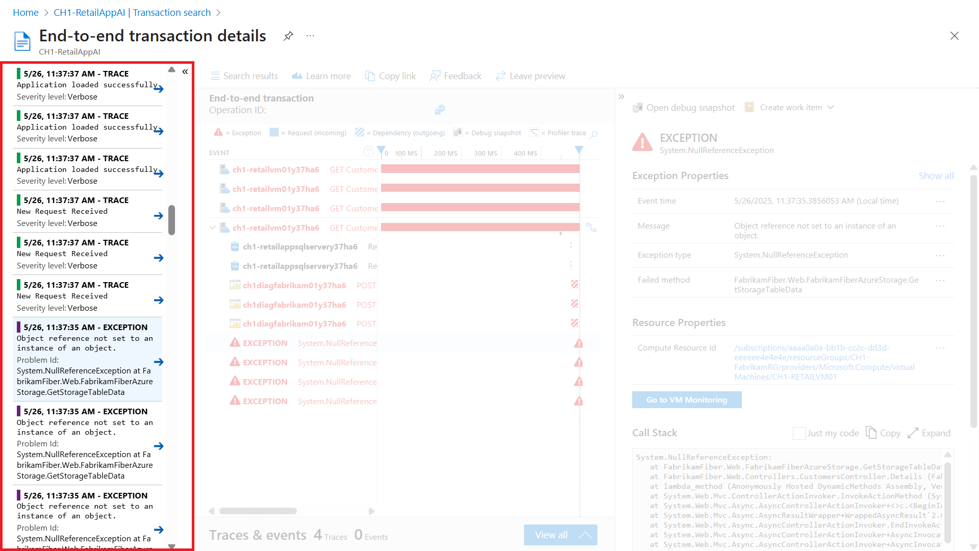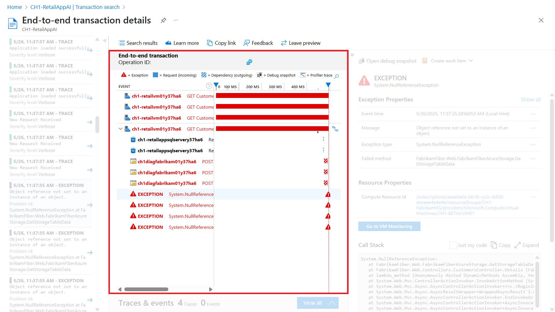 Все данные, собранные Application Insights, хранятся в Log Analytics. Он предоставляет широкий язык запросов для анализа запросов, которые создали исключение, которое вы изучаете.