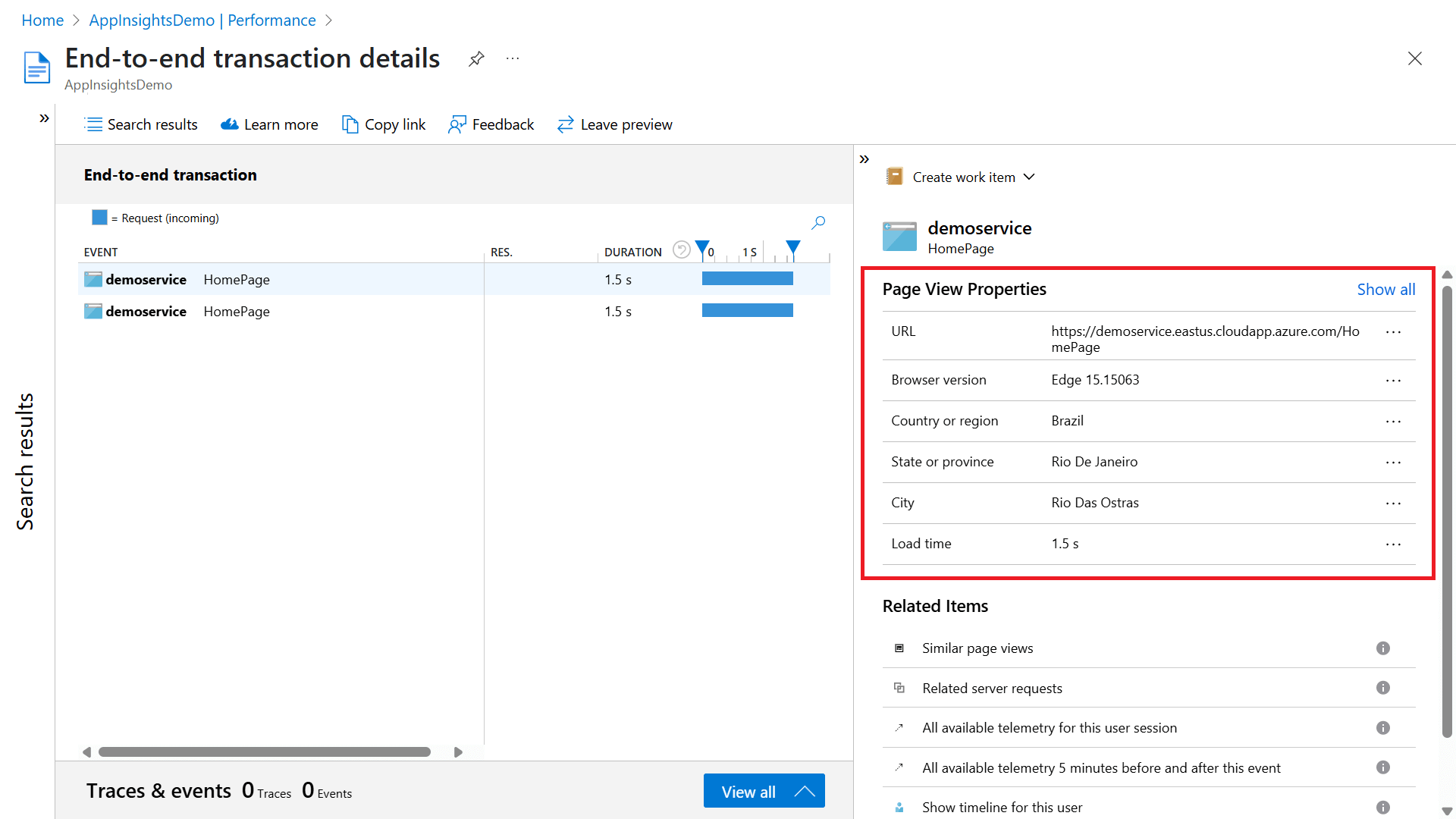 2. Для операций браузера в представлении сведений о сквозных транзакциях показываются свойства просмотра страницы для клиента, запрашивающего страницу, включая тип браузера и его местоположение. Эти сведения могут помочь определить, существуют ли проблемы с производительностью, связанные с определенными типами клиентов.