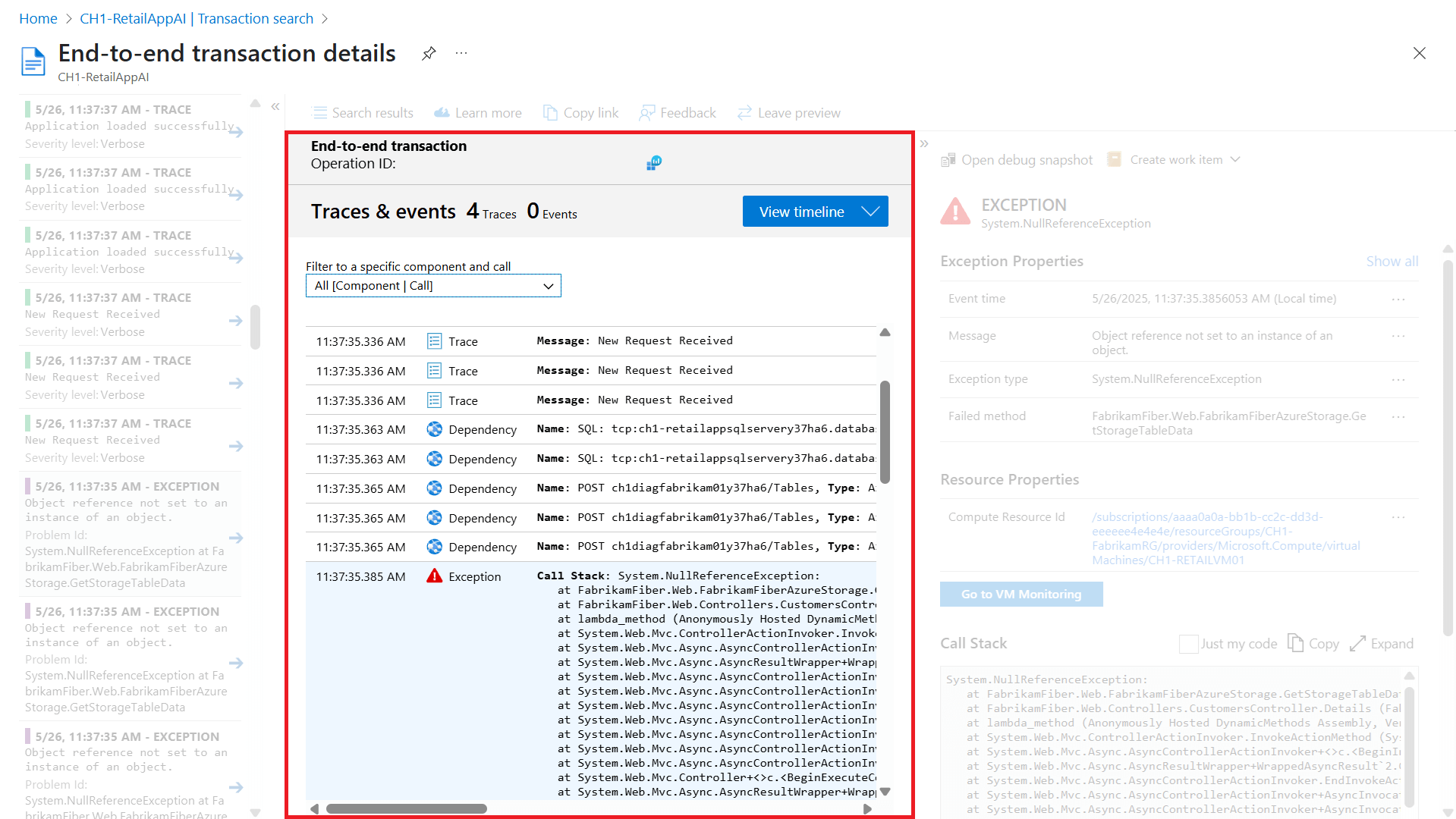 Временные шкалы на диаграмме транзакций приводятся в соответствие. Метки времени можно просмотреть в области сведений или с помощью Log Analytics.