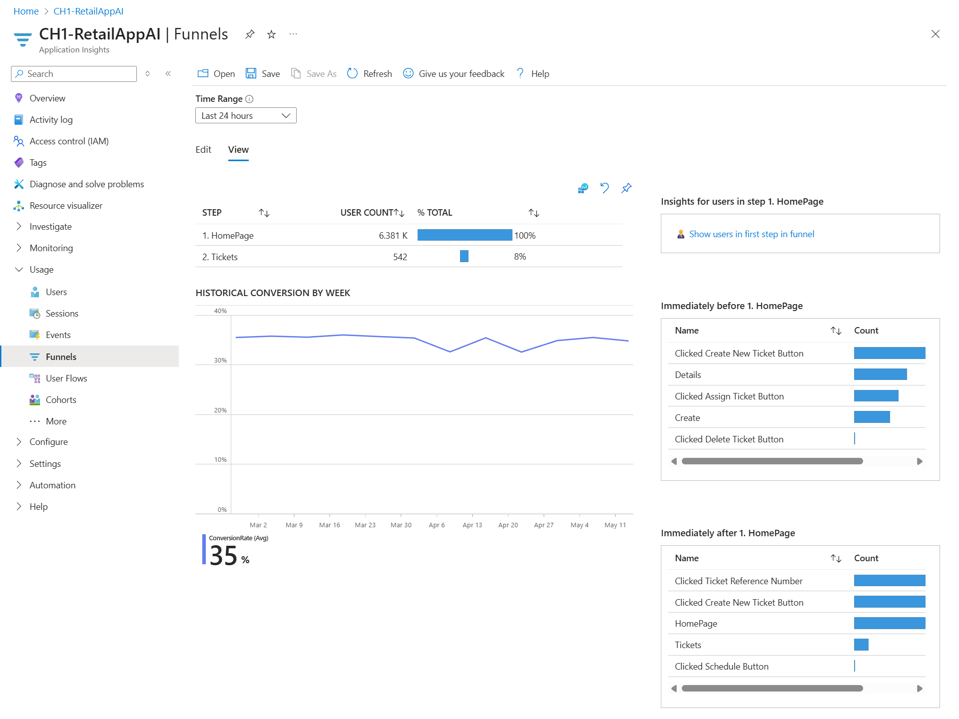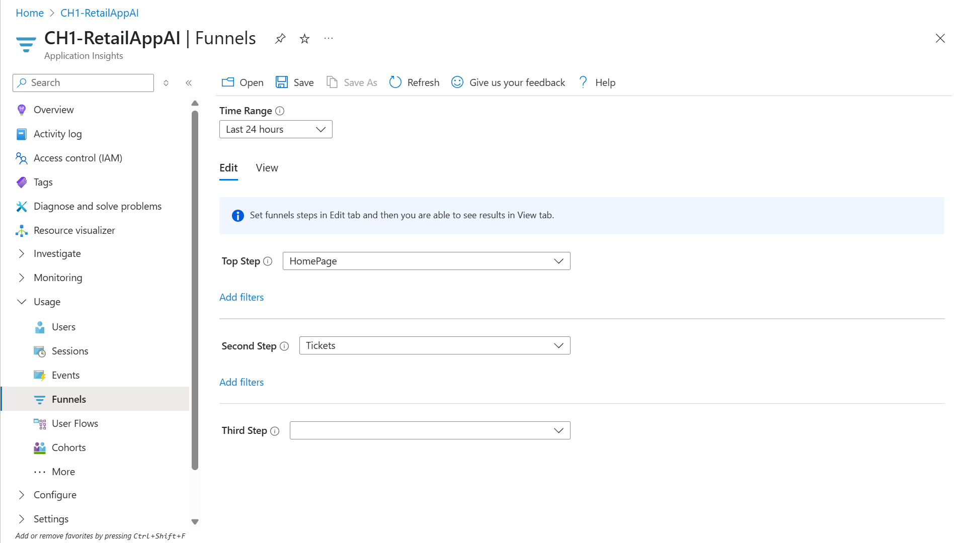 Воронки Application Insights можно использовать для получения аналитики о своих пользователях и отслеживания коэффициентов преобразования на каждом шаге. При выборе шага отображаются дополнительные сведения о шаге.