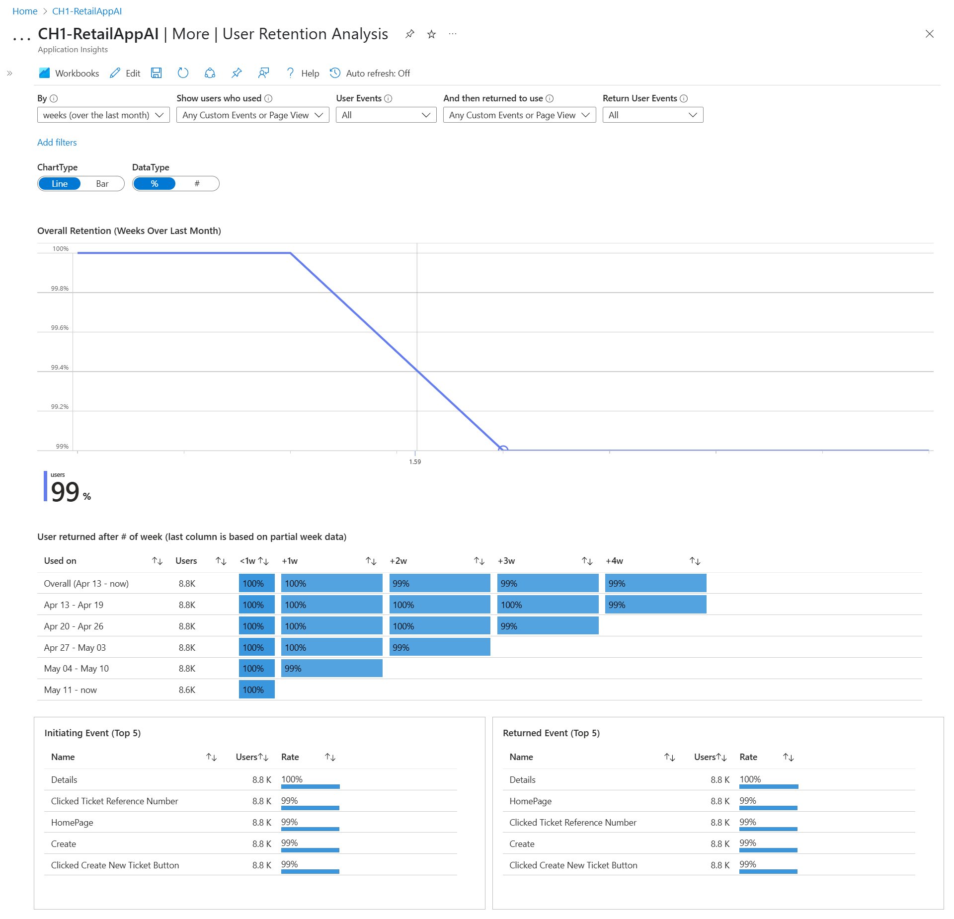 Так как активные пользователи должны иметь по крайней мере одно событие телеметрии с типом действия, метрики хранения требуют реализации подключаемого модуля Click Analytics для реализации Application Insights в приложении.