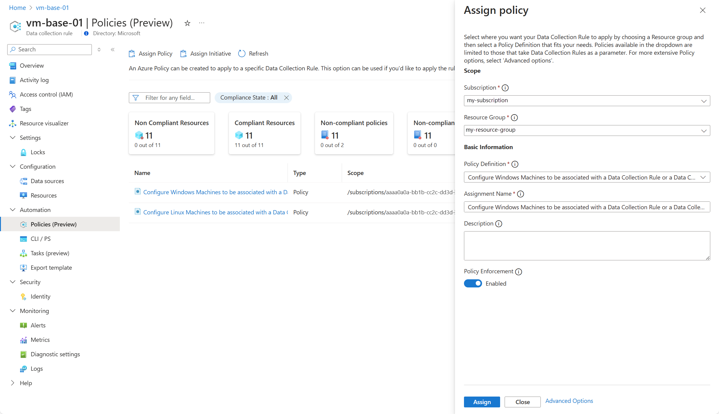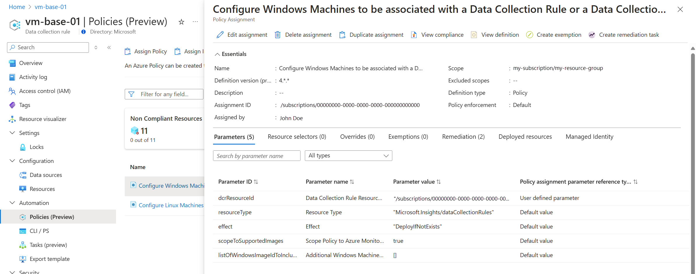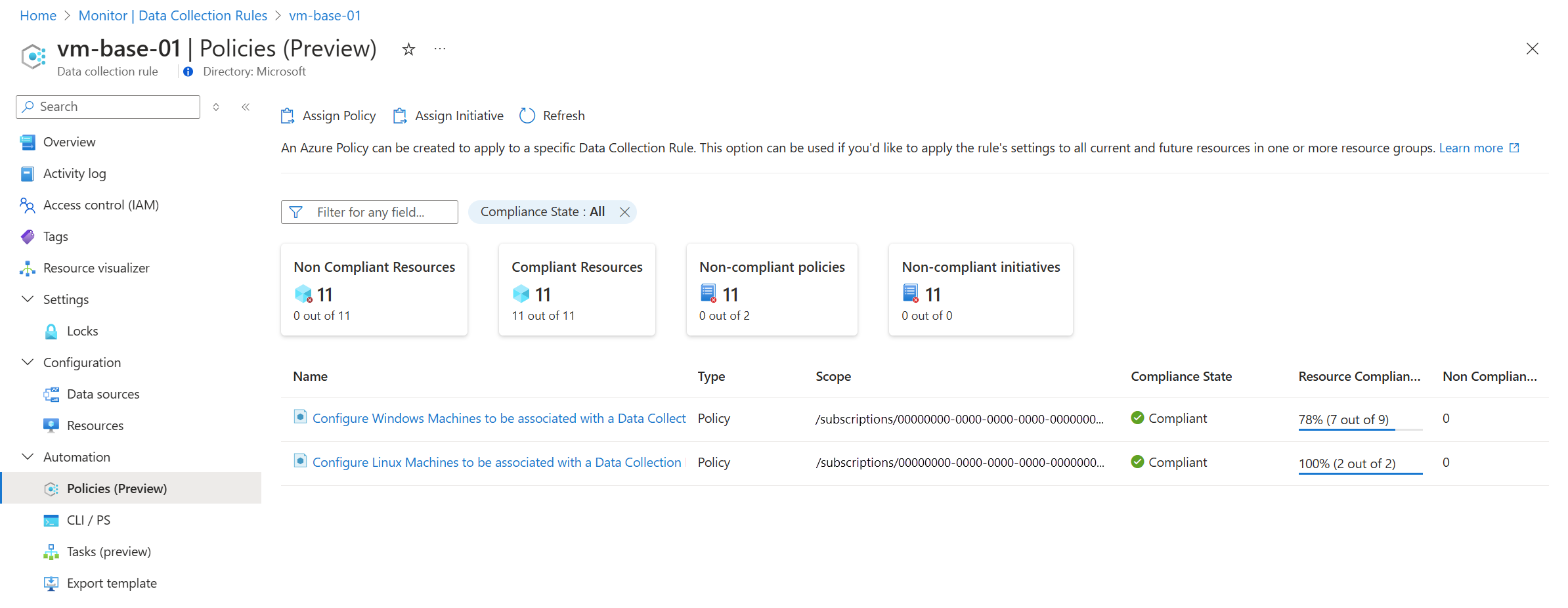 С помощью Azure Policy можно связать DCR с несколькими ресурсами в крупном масштабе. Когда вы создаёте задание между группой ресурсов и встроенной политикой или инициативой, устанавливаются ассоциации между DCR и каждым ресурсом назначенного типа в группе ресурсов, включая любые новые ресурсы по мере их создания. Azure Monitor предоставляет упрощенный пользовательский интерфейс для создания назначения политики или инициативы для определенного DCR, что является альтернативным методом создания назначения непосредственно через Azure Policy.