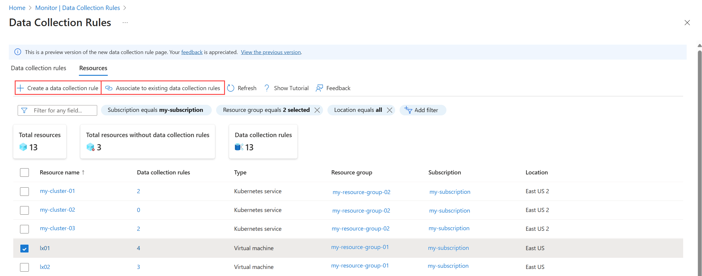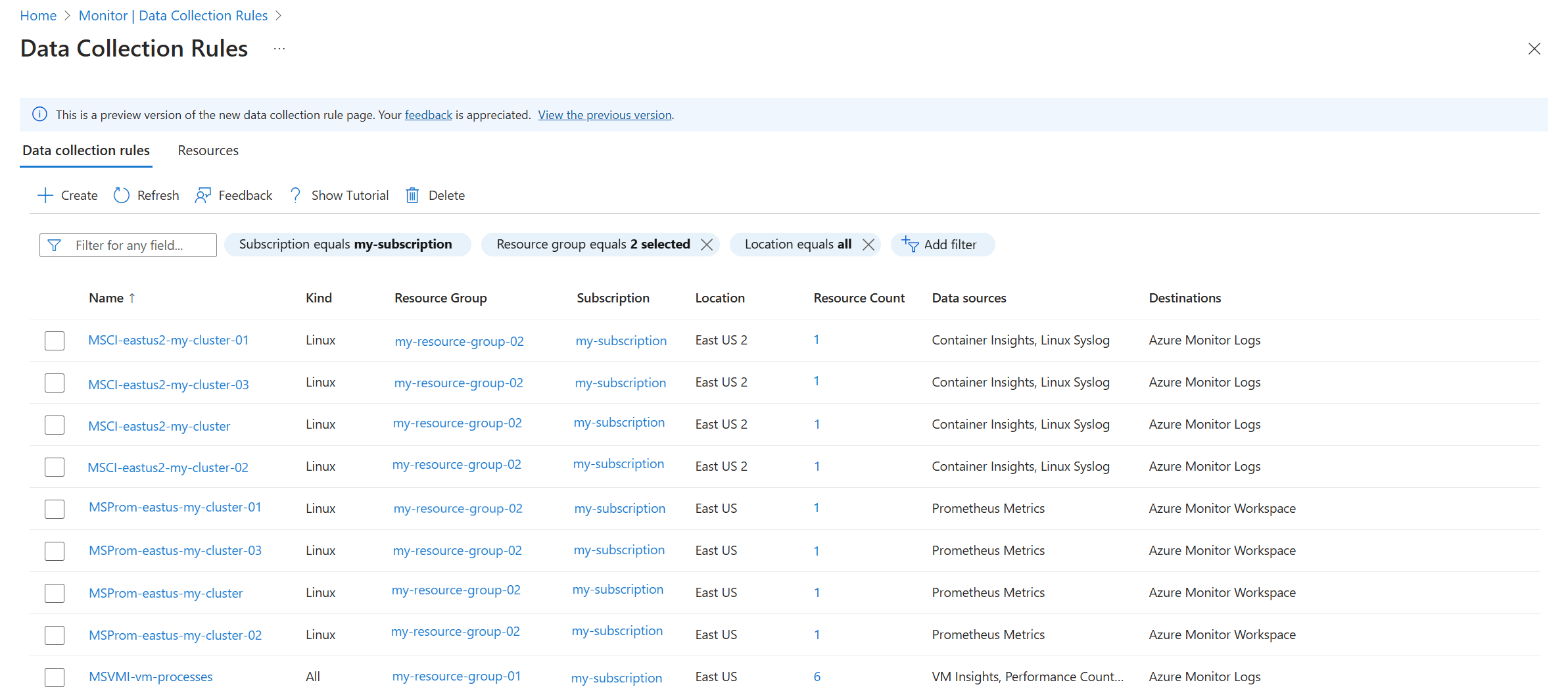 Предварительная версия нового опыта на портале Azure для DCR объединяет DCR и связанные с ними ресурсы. Список можно просмотреть по правилу сбора данных, в котором отображается количество ресурсов, связанных с каждым DCR, или по ресурсам, в котором показано количество DCR, связанных с каждым ресурсом.