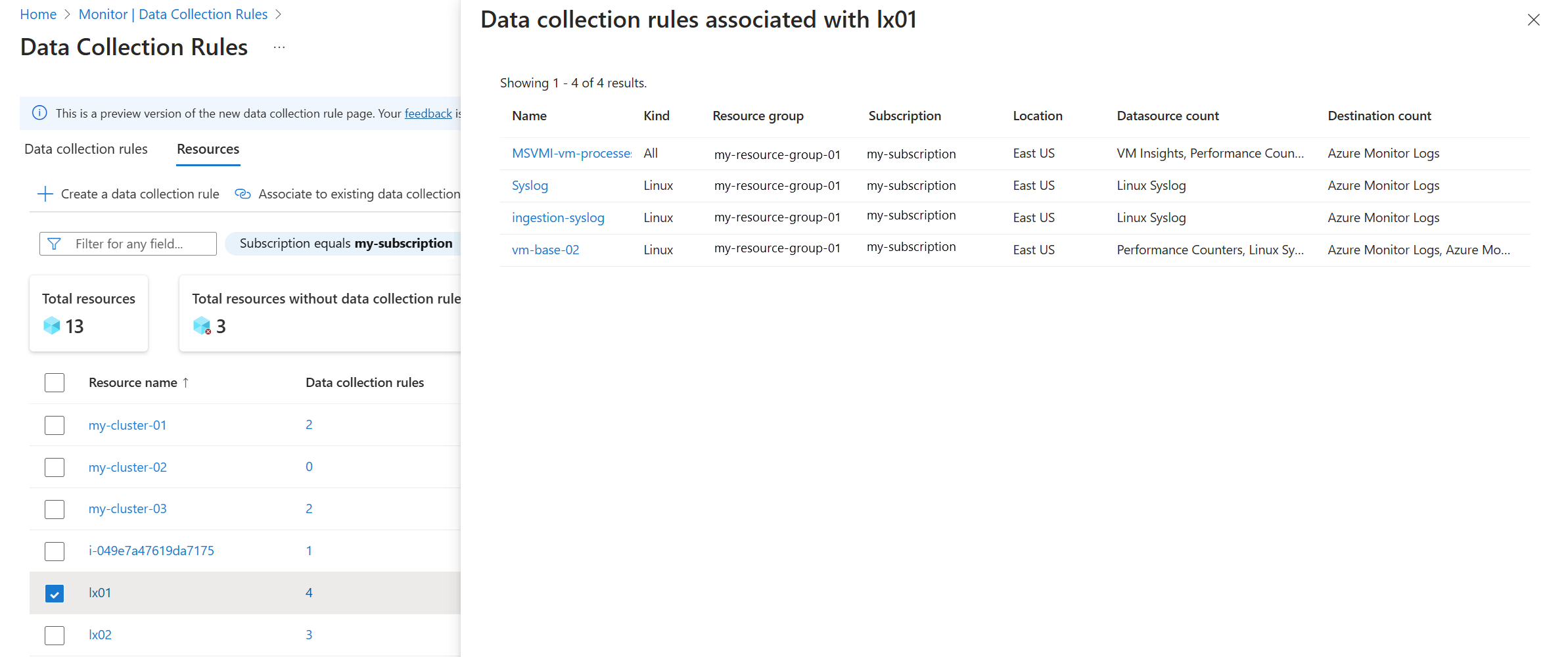 Столбец правил сбора данных указывает количество DCR, связанных с каждым ресурсом. Щелкните это значение, чтобы открыть новую панель, в которой перечислены DCR, связанные с ресурсом.