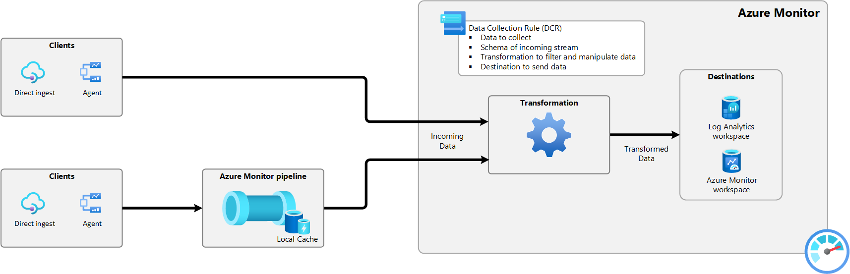 Конвейер Azure Monitor расширяет процесс сбора данных в собственный центр обработки данных. Он обеспечивает масштабируемую коллекцию и маршрутизацию данных телеметрии перед доставкой в облако.