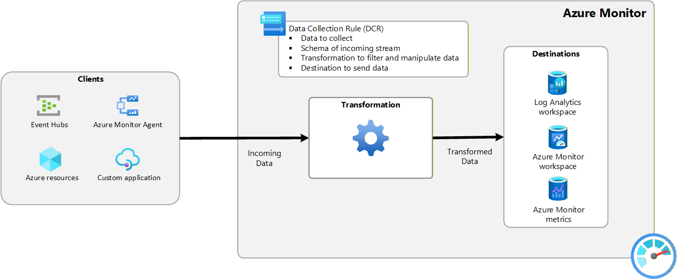 Процесс сбора данных, поддерживаемый контроллерами домена, предоставляет общий путь обработки входящих данных. Каждый сценарий сбора данных определяется в DCR. DCR содержит инструкции по обработке получаемых данных в Azure Monitor. В зависимости от сценария, DCR могут указать все или некоторые из следующих элементов: