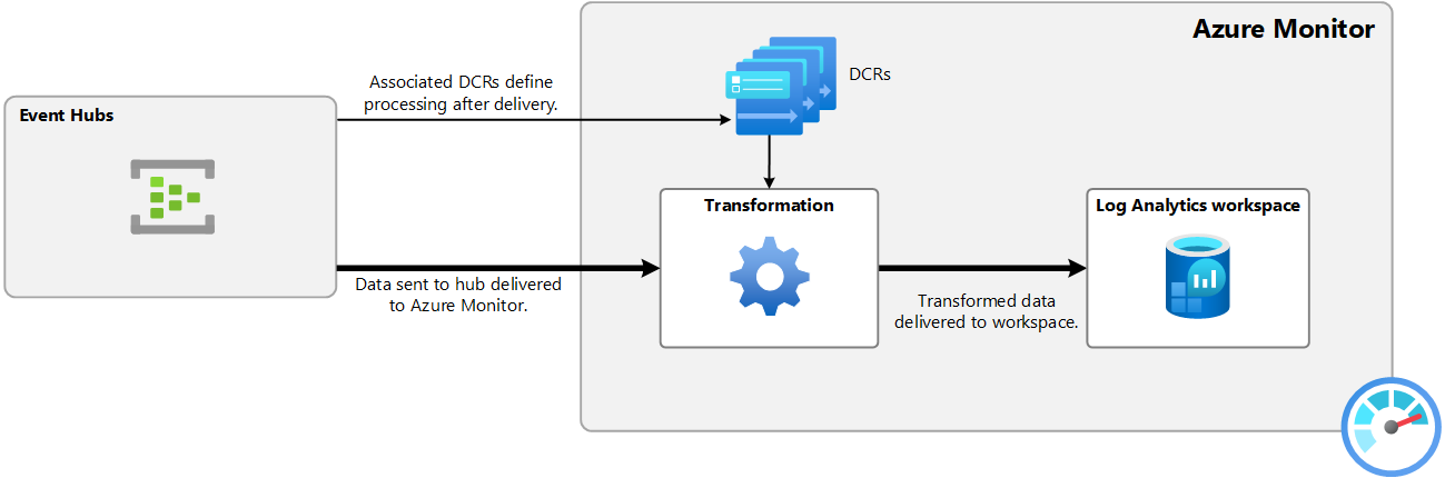 На следующей схеме показано, как данные поступают в рабочую область Log Analytics непосредственно из Центров событий. Когда данные получены узлом событий, они отправляются в Azure Monitor, а затем преобразуются и направляются в любые пункты назначения, указанные в любых правилах сбора данных, связанных с ними.