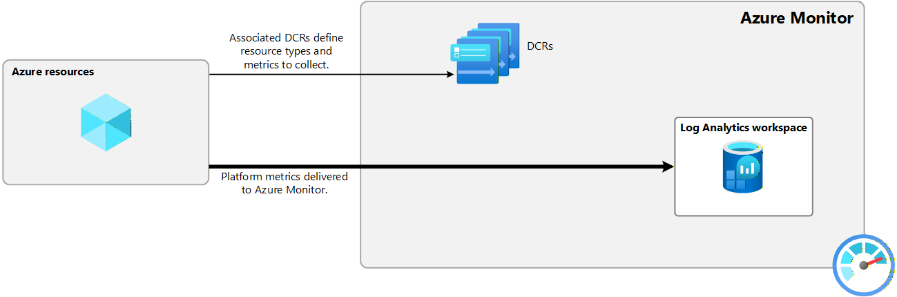 Метрики платформы автоматически собираются из ресурсов Azure и отправляются в Azure Monitor Metrics. На следующей схеме показан процесс использования DCR для отправки этих данных в рабочую область Log Analytics для анализа с помощью запросов журналов. Это заменяет текущий метод использования параметров диагностики для выполнения этой функции.