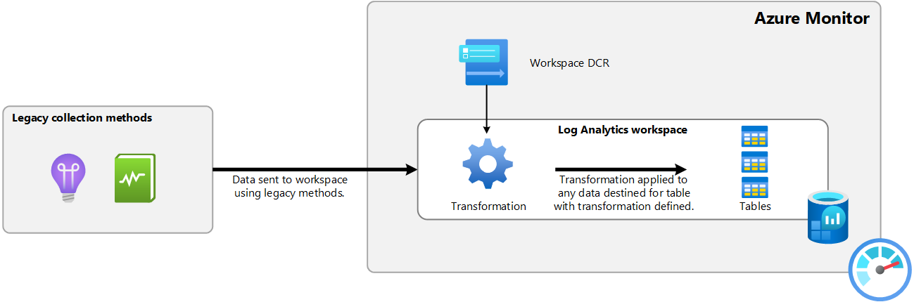 Преобразователи рабочей области предоставляют преобразования для сбора данных, которые не используют правила сбора данных (DCR). Они применяются непосредственно к рабочей области Log Analytics и автоматически активируются при их создании.