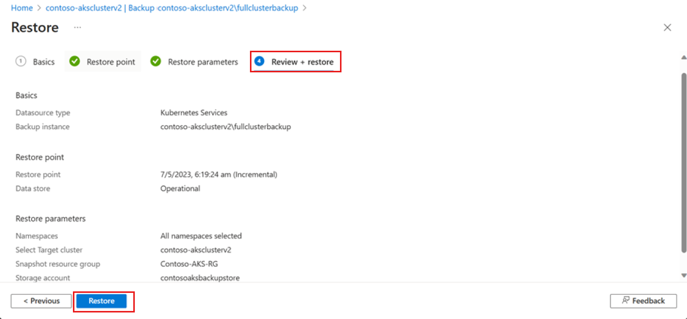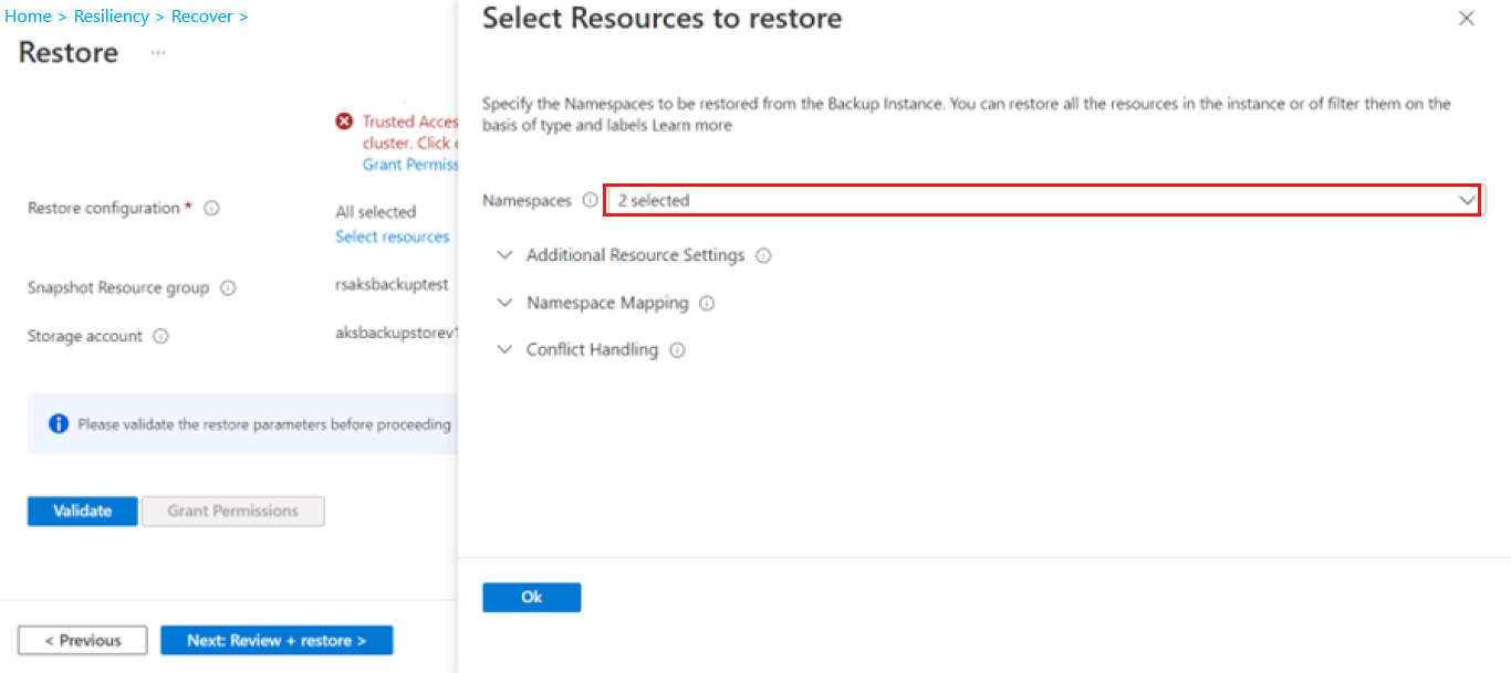 Можно также установить флажки, если требуется восстановить ресурсы кластера и постоянные тома (только диск Azure).