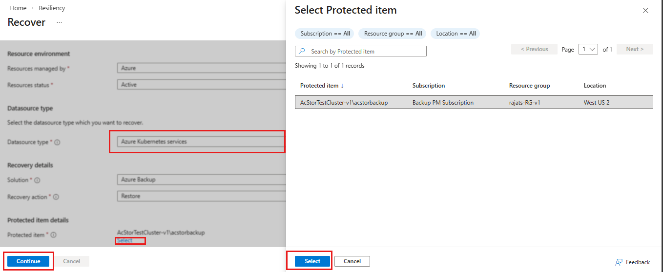 На панели "Выбор защищенного элемента " выберите из списка резервную копию кластера AKS и нажмите кнопку "Выбрать".