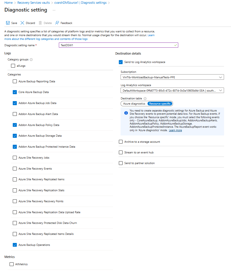 Данные для этих событий можно отправлять в учетную запись хранения, рабочую область Log Analytics или концентратор событий. Аккаунт хранения должен находиться в том же регионе, что и хранилища служб восстановления. Однако рабочая область Log Analytics может находиться в другом регионе. Если вы отправляете эти данные в рабочую область Log Analytics, выберите переключатель "Ресурс-специфичный" на экране параметров диагностики. Дополнительные сведения см. в следующих разделах.