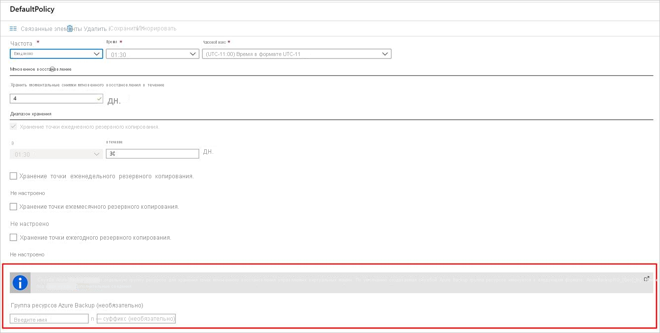 Azure Backup создает отдельную группу ресурсов, отличную от группы ресурсов виртуальной машины, для хранения коллекции точек восстановления (RPC). В коллекции хранятся точки мгновенного восстановления для управляемых виртуальных машин. Группа ресурсов, созданная Azure Backup, имеет формат именования по умолчанию AzureBackupRG_<Geo>_<number>. Примером является AzureBackupRG_northeurope_1. Теперь можно настроить имя группы ресурсов, созданное Azure Backup.