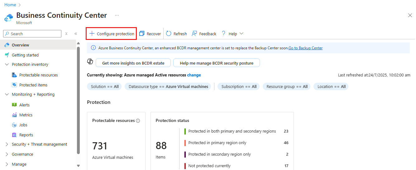 Перейдите в Центр непрерывности бизнес-процессов и выберите +Настроить защиту.