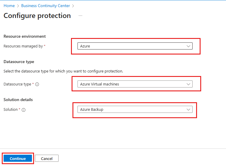 На панели "Настройка защиты" выберите ресурс, управляемый в качестве Azure, тип источника данных в качестве виртуальных машин Azure, решение как Azure Backup, а затем нажмите кнопку "Продолжить".