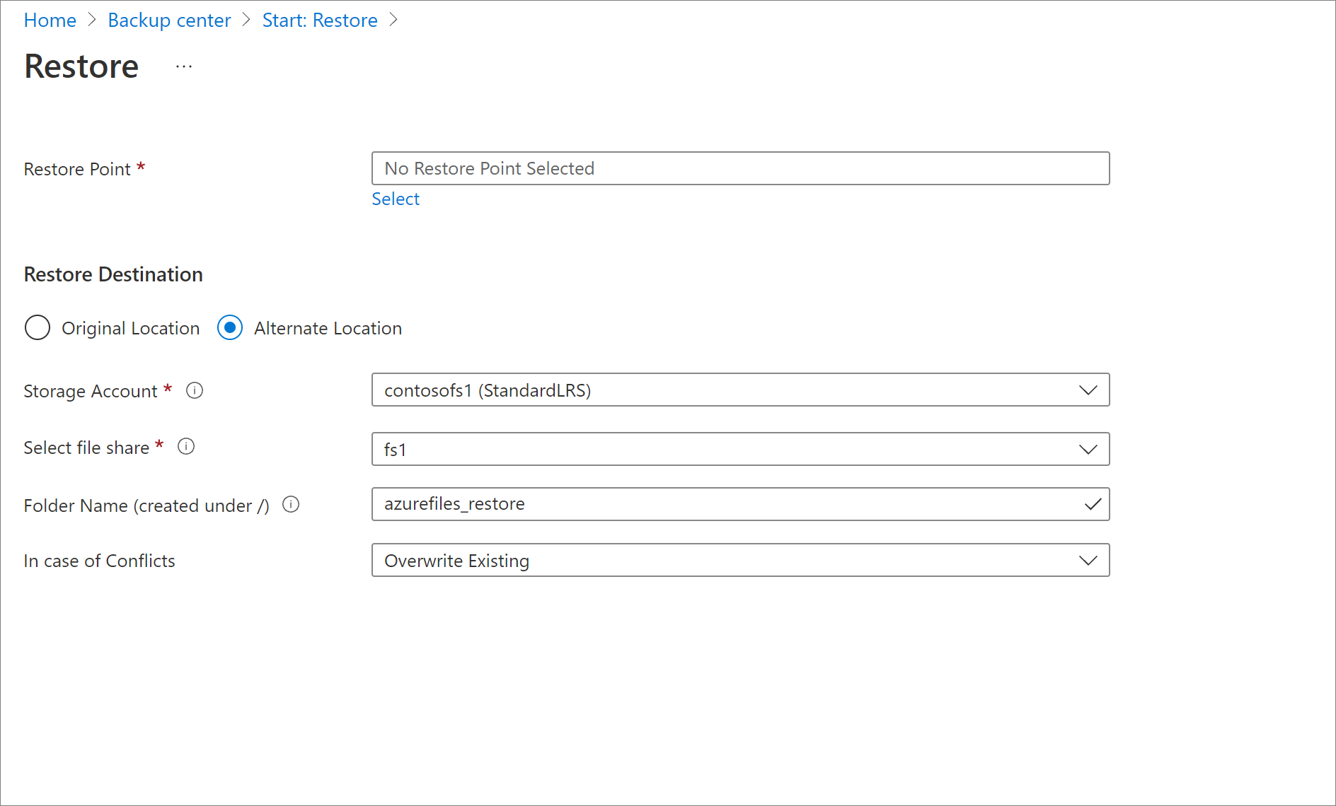 Резервное копирование в резервном хранилище в настоящее время поддерживает только полное восстановление данных общего доступа в альтернативном местоположении. Целевой файловый ресурс, выбранный для восстановления, должен быть пустым.