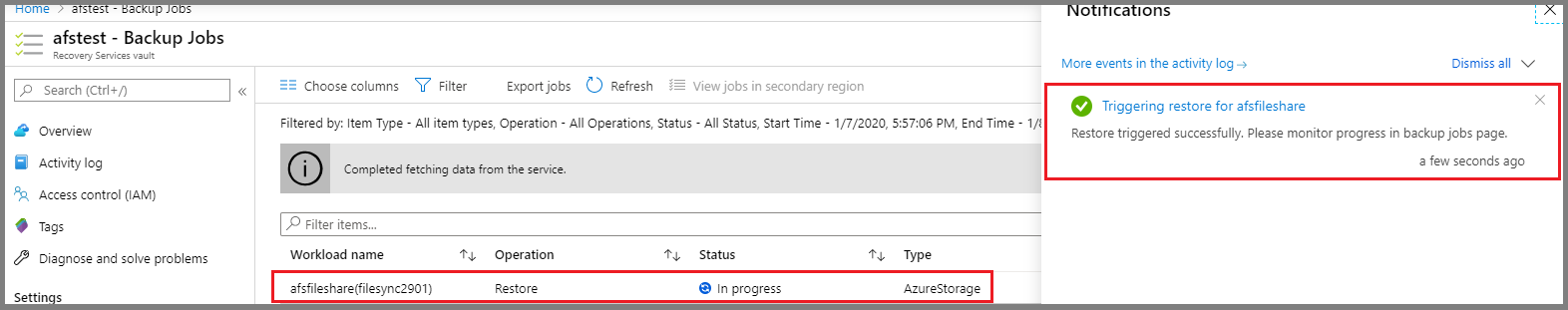 Когда вы запускаете операцию восстановления, служба Backup создает задание для отслеживания операции. Azure Backup отображает уведомления о задании на портале. Чтобы просмотреть операции в этом задании, щелкните гиперссылку уведомлений.