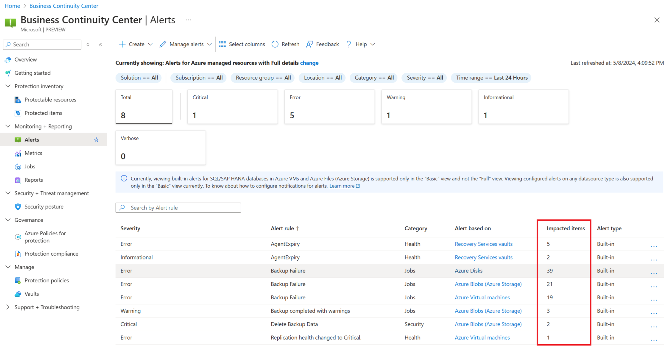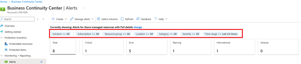 On Business Continuity Center, go to Monitoring + Reporting>Alerts.