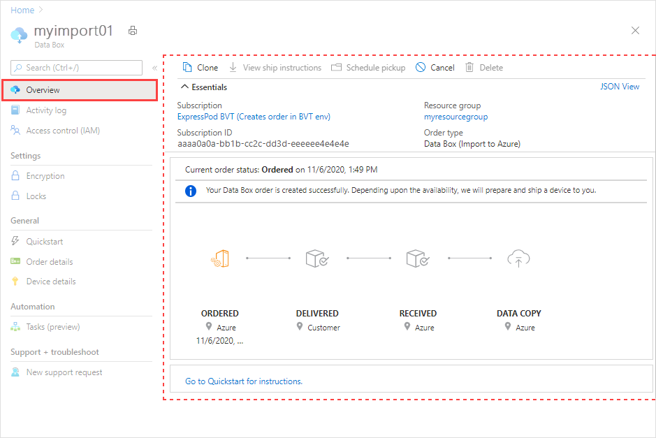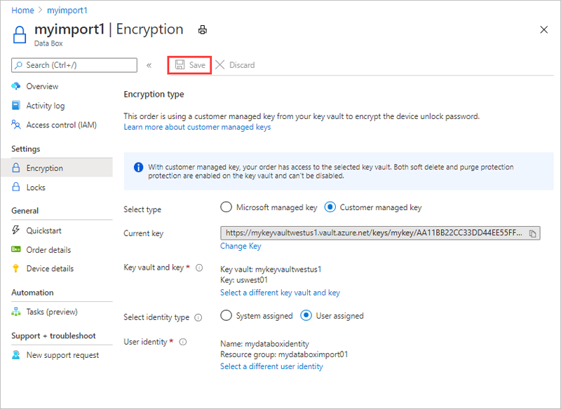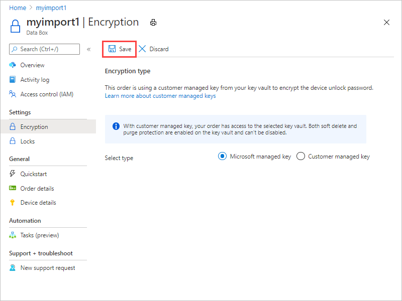 Чтобы обеспечить этот уровень контроля в рамках процесса заказа, используйте ключ, управляемый клиентом, при создании заказа. Дополнительные сведения см. в статье Руководство по оформлению заказа на Azure Data Box.