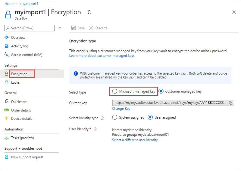 На экране "Обзор " для заказа Data Box перейдите в раздел>"Параметры шифрования" и выберите "Изменить ключ".