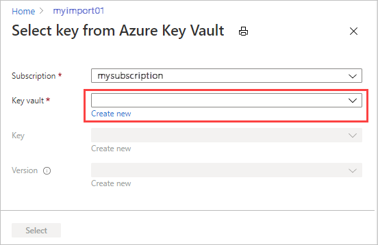 Откроется страница выбора ключа из Azure Key Vault , и ваша подписка автоматически заполняется в раскрывающемся списке. Выберите существующее хранилище ключей в раскрывающемся списке хранилища ключей или нажмите кнопку "Создать" , чтобы создать новое хранилище ключей.