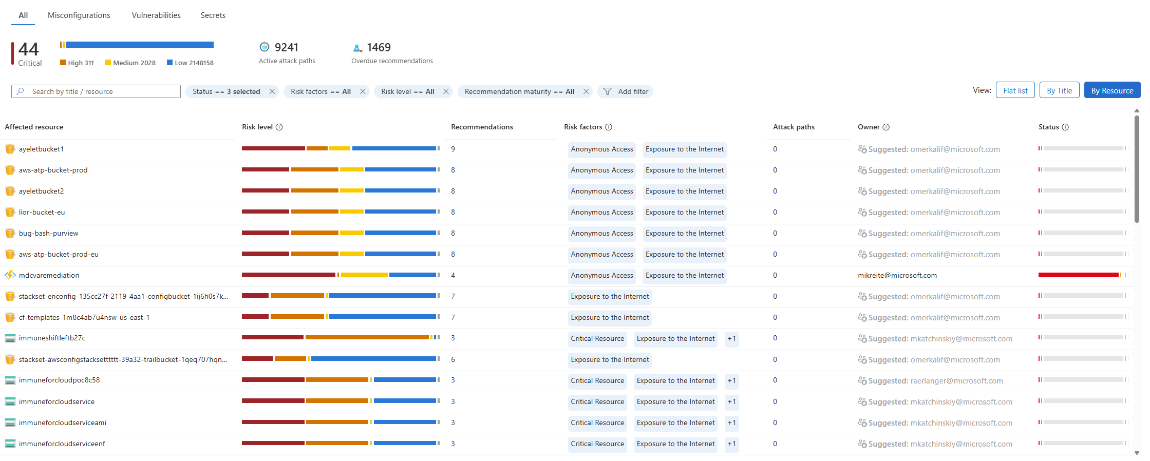 В этом представлении отображается список всех рекомендаций, организованных отдельными активами, упорядоченными по уровню риска. Каждая строка представляет одну рекомендацию, влияющую на определенный ресурс.