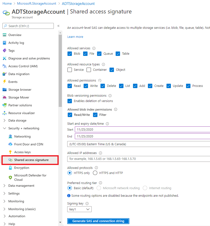 Затем создайте токен SAS для вашего учетной записи хранилища, чтобы конечная точка могла использовать его для доступа.