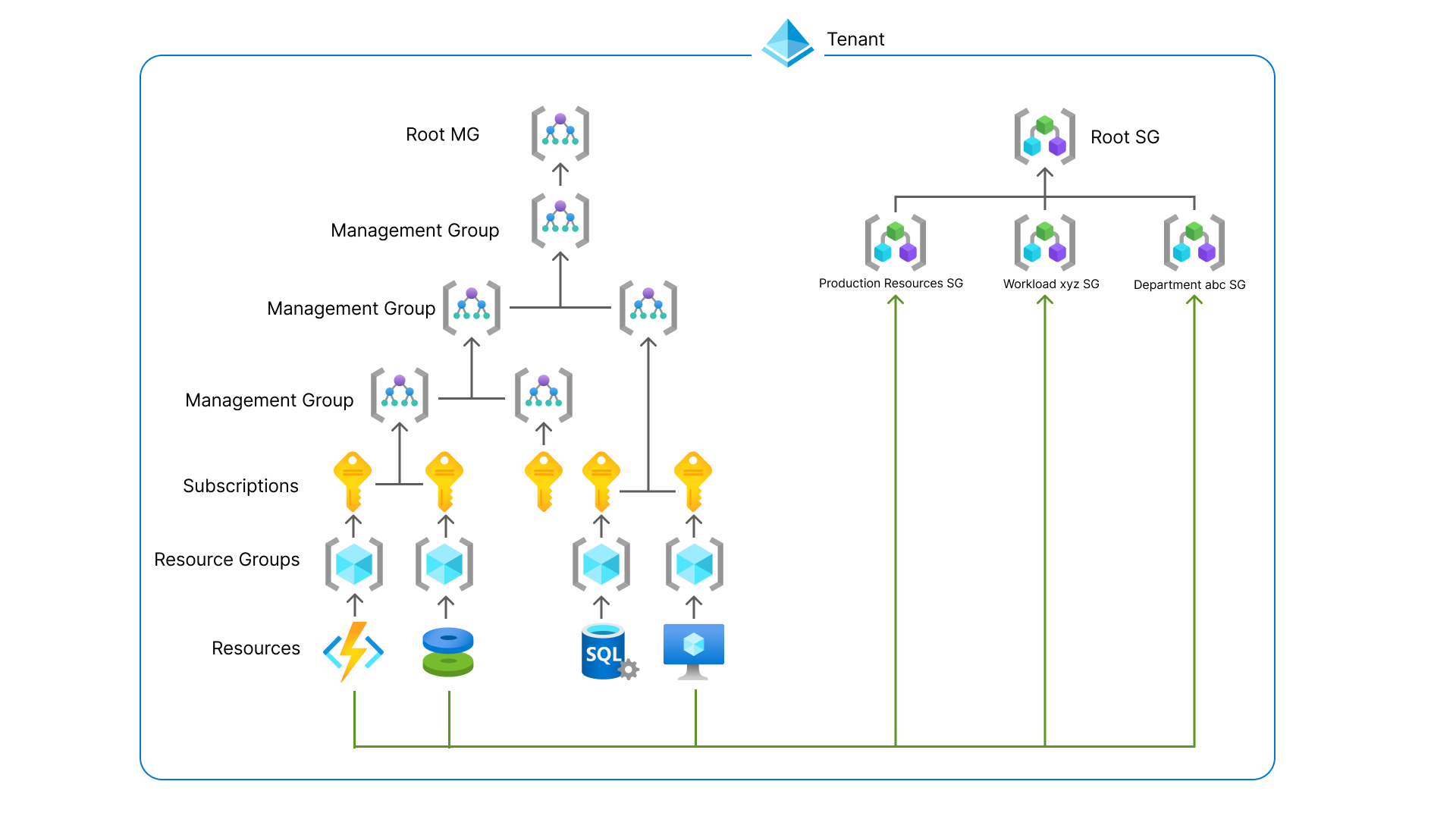| Scenario | Группа ресурсов | Subscription | Группа управления | Группа служб | Tags |