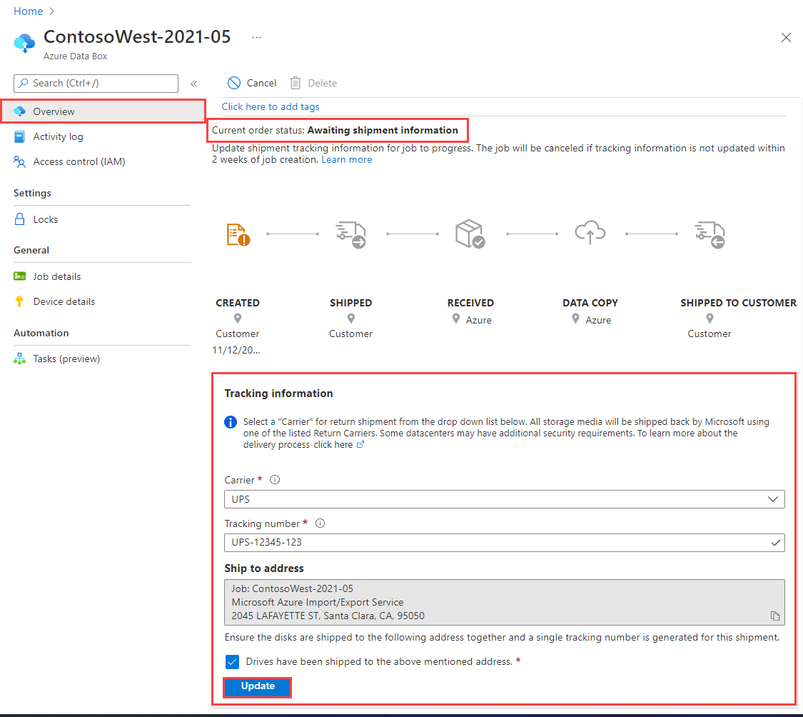 - Просмотрите сведения о задании. Запишите имя задания и адрес доставки центра обработки данных Azure для отправки дисков обратно. Эта информация указывается позже на транспортной этикетке.
