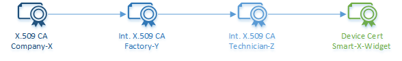 В нашем примере проверка подлинности на основе сертификатов означает, что каждый smart-X-Widget должен иметь уникальный сертификат устройства. Вместо создания отдельных пар сертификатов и ключей для каждого устройства Компания-X решает использовать сертификаты ЦС и создать цепочку доверия для каждого устройства.