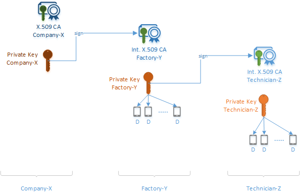 Владелец сертификата ЦС X.509 может криптографически подписать промежуточный ЦС, который, в свою очередь, может подписать другой промежуточный ЦС и т. д., пока последний промежуточный ЦС не подписывает сертификат устройства. Результатом является каскадная цепочка сертификатов, известная как цепочка сертификатов доверия. Это делегирование доверия важно, так как оно устанавливает цепочку хранения и избегает совместного использования ключей подписывания.