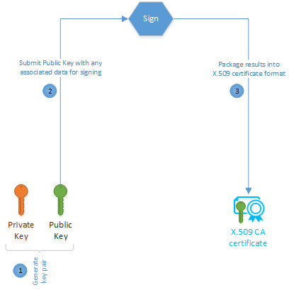 Компания X может приобрести сертификат ЦС X.509 у общедоступного корневого центра сертификации или создать его с помощью самозаверяющего процесса. Независимо от варианта, процесс предусматривает два основных этапа: создание пары открытого и закрытого ключей и подписание открытого ключа в сертификате.