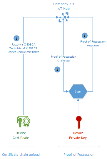 Устройства, которые должны пройти аутентификацию ЦС X.509, снабжены уникальными сертификатами устройств и цепочкой сертификатов соответствующей производственной цепочки поставок. Даже первое подключение устройства происходит в два этапа: передача цепочки сертификатов и подтверждение владения.