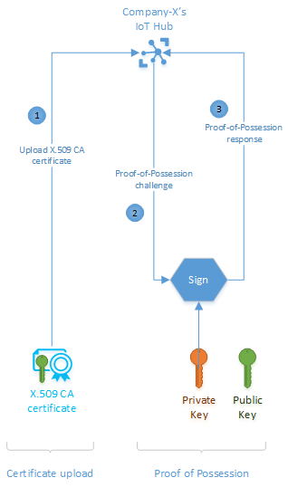 Сертификат ЦС X.509, как и любой цифровой сертификат, является общедоступной информацией, которая подвержена атакам перехвата информации. Таким образом, прослушивание может перехватывать сертификат и пытаться передать его как собственный. В нашем примере Центр Интернета вещей хочет удостовериться, что передаваемый сертификат ЦС компании X действительно принадлежит этой компании. Центр Интернета вещей требует, чтобы компания доказала, что она действительно владеет сертификатом, с помощью потока подтверждения владения.