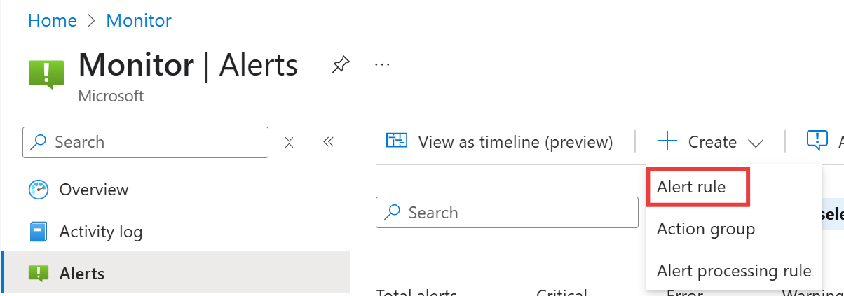 Выберите оповещения в области навигации слева, а затем + Создать, а затем правило генерации оповещений.